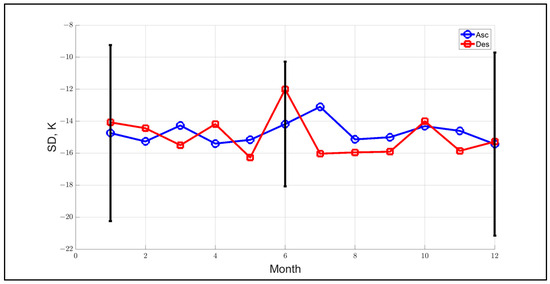 OSD dependence on time (month) for 2022, where TXP ascending orbit segment is blue curve, and OSD descending orbit segment is red curve, and error bars represent ±1 sigma standard deviation.
