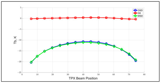 Next, for the entire year, collocation boxes, subdivided by TPX beam position (EIA), were processed to produce binned averages of the DD, with respect to TPX beam position (Figure 16). As before (Figure 10), the OSD is the same “inverted parabolic curve” (blue), but now the MSD curve (green) is nearly identical, and the difference between these curves is the XCAL DD radiometric bias, which is plotted above in red. The DD bias curve is flat (peak to peak < 1 K), which indicates negligible systematic dependance on the TPX beam position.