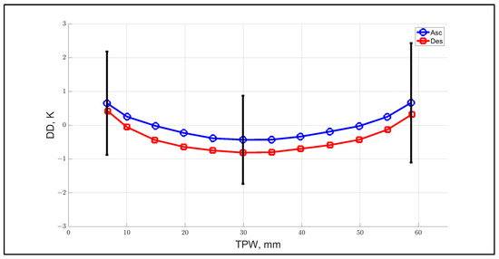 Binned average DD with respect to TPW, calculated for one year of GMI/TPX match-ups that are separated into TPX ascending (daytime) and descending (nighttime) orbit segments, and error bars represent ±1 sigma standard deviation.