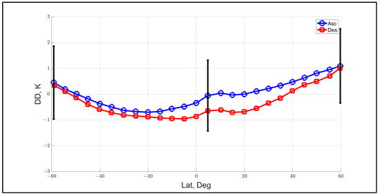 Next, consider the monthly variability of the XCAL DD bias calculated separately for ascending (blue) and descending (red) for one year that is shown in Figure 18. Again, the two curves are separated, but the values are more randomly distributed, and, overall, the curves are flat, which does not indicate any systematic seasonal effects.