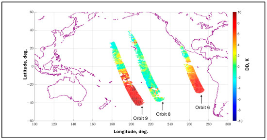 During the conduct of this investigation, it was discovered that, on occasion, the calibration of the TPX radiometer exhibited anomalous “step-function” changes, which lasted for periods of approximately one orbit. For example, consider the upper panel of Figure 23, an image of TPX DD bias for ascending orbit segments on 19 January 2022. In the southern hemisphere Pacific Ocean, there are two regions (orbit 6 and 9) with anomalously large DD biases (shown in red).