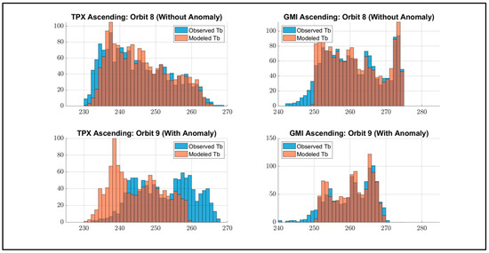 Observed and modeled Tb histograms for 19 January 2022 for TPX descending orbit segments. Upper panel is orbit 8 (without anomaly) and lower panel is orbit 9 (with anomaly), and left side is TPX (OSD and MSD) and right side is GMI (OSD and MSD).