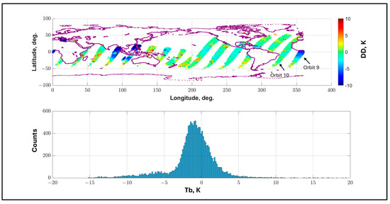 Global ocean coverage (19 January 2022) for GMI/TPX match-ups for TPX descending orbit segments (upper panel), where color bar represents the DD values, and the lower panel shows histograms for DD.