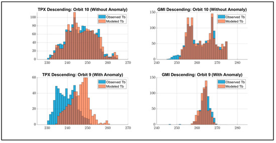 On the other hand, results are also presented in Figure 28 for TPX orbit9 (anomaly) in the lower left panel. Here, the results are the same as before (Figure 26), except that the TPX-observed Tb histogram (blue) is now shifted left (−6 K) relative to the corresponding upper panel. As before, the GMI histograms match well. The cross-correlation results of the observed and modeled Tb histograms were 0.94 with a negative lag of −6 deg K for TPX and 0.96 with positive lag of +2 K for GMI.