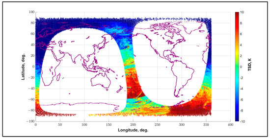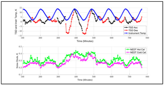 An evaluation procedure was developed to detect the anomaly occurrence, which was based on the comparison of the time series of swath-average TSD with the corresponding instrument temperature, and an example is presented for January 19 in the upper panel of Figure 30. The instrument temperature varies sinusoidally over the orbit period because the ascending orbit segment is daytime, and descending is nighttime. If temperature were a factor in the TPX anomaly, then it should be readily apparent from these time-series plots. Unfortunately, this is not the case for the TPX anomaly that occurs between 350 and 500 min. Moreover, the TPX data record also has the associated noise calibration NEDT measurements (green = hot) and (magenta = cold), which are also plotted. Since there is an obvious increase in the NEDT during the anomaly period, there is an ongoing investigation to establish the root cause of the Tb anomaly.