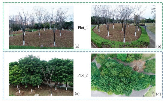 The structures and shapes of two plots used in this study. Upper panel: (a,b) Plot_1 with leafless trees as observed from two views from mid-air; lower panel: (c,d) Plot_2 with leafy trees viewed from mid-air and from overhead position.