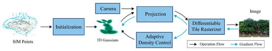 Figure 2 shows an overview of the 3DGS rendering pipeline. The whole process can be divided into forward and backward stages. In the forward stage, based on the 3D Gaussian points and camera positions, the projections of the 3D Gaussian distributions and spherical harmonic functions onto the 2D plane are computed. Then, the Gaussian functions are overlaid and blended on the 2D plane, ultimately synthesizing the rendered image. In the backward phase, the loss is evaluated by calculating the difference between the rendered image and the real image, which is then used for backpropagation. The gradients from backpropagation are used to optimize the mean, covariance matrix, opacity, and spherical harmonic coefficients of the 3D Gaussian points. The loss function consists of a weighted sum of the minimum absolute deviation (L1) and the structural similarity loss (LD-SSIM), as follows: