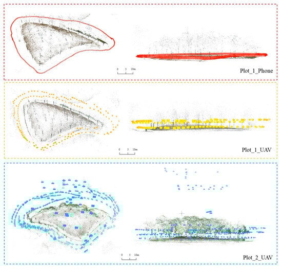 We used multiple devices and methods for data collection. An iPhone (Apple Inc., Cupertino, CA, USA) 11′s camera (12-megapixel, f/1.8) was used to capture 4K video footage of Plot_1 on the ground. Individual frames were then extracted from the video at a rate of 2 frames per second (fps), ensuring an overlap of over 70% between consecutive images. Additionally, a RGB camera (20-megapixel, f/2.8–f/11) on DJI Phantom 4 UAV (DJI, Shenzhen, China) was employed to manually collect image data of both Plot_1 and Plot_2. First, the UAV was hand-held to capture images at regular intervals while walking around the plots, followed by manual control of the UAV to capture aerial images above both plots. In both cases, an overlap of more than 70% was ensured between consecutive images. Figure 3 shows the camera positions for Plot_1 and Plot_2 obtained after being processed with COLMAP. These consumer-grade cameras are not only inexpensive but also easy to operate, and are widely used by the general public. The image resolution and number of images are detailed in Table 1. The two plots were also scanned by a RIEGL VZ-400 (Riegl, Horn, Austria) terrestrial laser scanner (with the following parameters: accuracy of 3 mm, precision of 5 mm, laser beam divergence of 0.35 mrad, and angular resolution of 0.04 degrees). In order to obtain complete reference point cloud data, six scan stations were strategically placed around each plot to ensure maximal coverage. The point clouds from multiple scans were then coarsely and finely registered in the RiSCanPro software (Version 1.7.5), with a registration accuracy of approximately 4 mm. The Lidar point cloud data and image data for two plots were collected on the same day under clear and windless weather conditions.