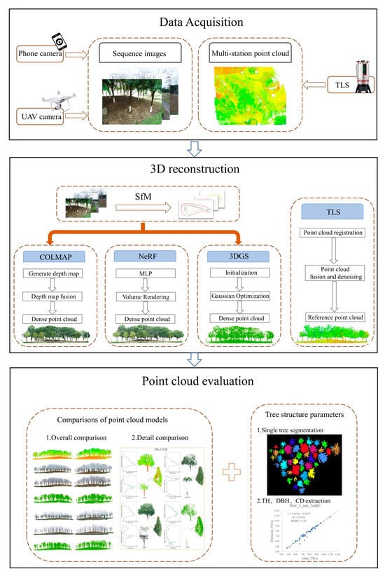 Complete workflow of this study. Data Acquisition involves taking sequential images from various angles using different cameras, as well as laser scanning to obtain reference point cloud; during 3D reconstruction images were processed with SfM in COLMAP to obtain camera poses and sparse point clouds, which were further fed into three separate reconstruction methods: photogrammetry (COLMAP), NeRF, and 3DGS to generate dense points. Finally, these dense point clouds are registered and compared with reference point cloud obtained from TLS for a comprehensive evaluation of the point cloud models.