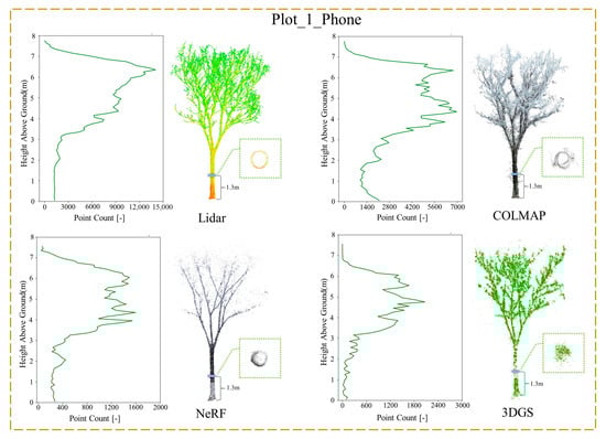 A single-tree model was selected from the point cloud model, and the vertical distribution of points was analyzed at 0.1 m intervals. Figure 6 and Figure 7, from left to right, show the vertical point distribution of the single-tree point cloud, the single-tree model, and a 10 cm thick trunk cross-section at a height of 1.3 m. Using the Lidar point cloud as a reference, its canopy region has a higher number of points, while the point distribution becomes smoother in the trunk region. In Plot_1_Phone, the three point clouds are generally similar to the Lidar distribution, but the COLMAP model exhibits significant fluctuations in the trunk region due to noise points, while the 3DGS model has fewer points in the trunk region. In Plot_1_UAV, the point distribution trend of NeRF aligns most closely with Lidar. Compared to the Phone dataset, the three tree point cloud models show an increased number of points in both the canopy and trunk regions. In the cross-sectional profiles of tree trunks, Lidar and NeRF models exhibit relatively smooth hollow circles, COLMAP model shows erroneous overlapping positions that increase the trunk diameter, and 3DGS model forms a solid circle with a smaller diameter.