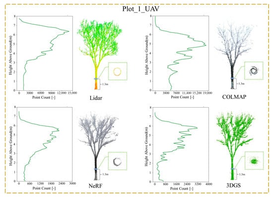 Detailed comparison of Plot_1_UAV reconstruction results. This includes single-tree models extracted from the forest point clouds of Lidar (TLS), COLMAP, NeRF, and 3DGS, as well as their vertical point distributions and the trunk cross-section profile at a height of 1.3 m.