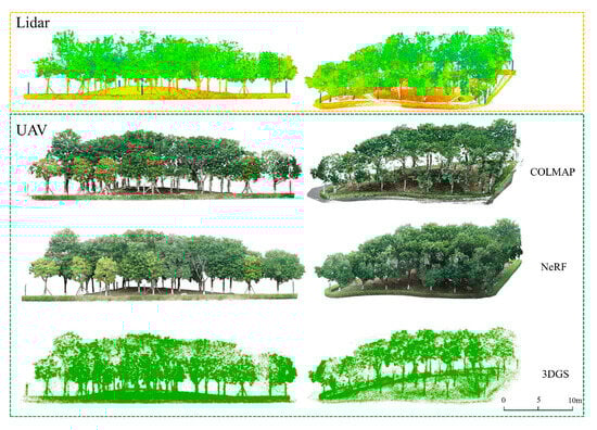 Figure 8 displays the 3D reconstruction results of Plot_2, also from two different perspectives. The results indicate that the NeRF model is visually the best, achieving denser canopy 3D reconstruction with photorealistic color and minimal noise. Although the COLMAP model has the highest point density, there are missing areas in the canopy and some tree trunks. The 3DGS model is the sparsest, with more missing areas in the canopy and tree trunks compared to COLMAP and NeRF results.