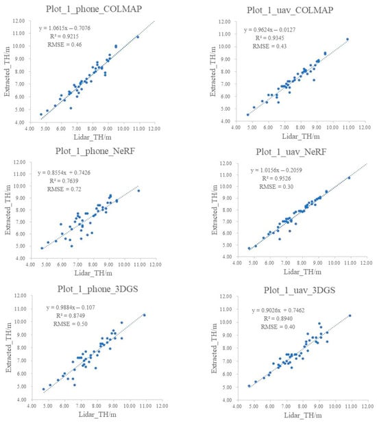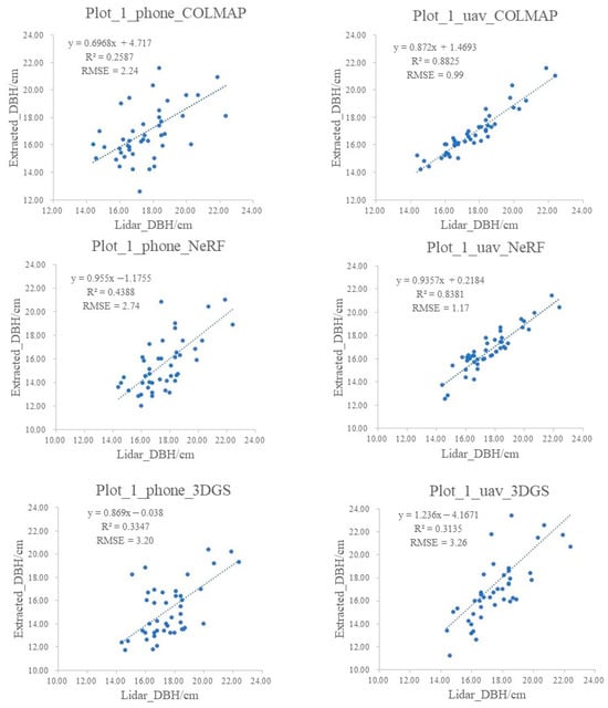 Figure 10 and Figure 11 display the results of linear fitting between the TH and DBH extracted from three models and the Lidar reference values for Plot_1. For three THs, Phone_COLMAP and Phone_3DGS show good fitting with Lidar, with R2 of 0.9215 and 0.8749, and RMSE values of 0.46 m and 0.50 m, respectively. Phone_NeRF suffers from a misalignment of ground and tree trunk points, which affects the accuracy of TH extraction, resulting in an R2 of 0.7639 and an RMSE of 0.71 m. The three models reconstructed from UAV imagery improve the accuracy of TH extraction, with R2 values of 0.9345, 0.8940, and 0.9526 for COLMAP, 3DGS, and NeRF, respectively, representing improvements of 1.60%, 1.91%, and 18.87% compared to the Phone models. RMSE values also decrease to 0.43 m, 0.40 m, and 0.29 m, respectively.