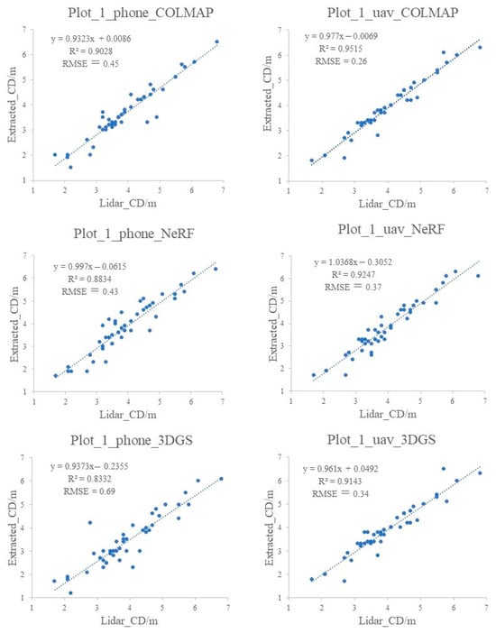 Figure 12 shows the crown diameter extraction results of the Plot_1 model. The linear fits of each model are relatively good, among which uav_COLMAP achieves the highest R2 value of 0.9515 and an RMSE of 0.26, while the lowest is phone_3DGS with an R2 value of 0.8332 and an RMSE of 0.69. Similarly, the UAV models exhibit better fits compared to the Phone models, with the R2 increasing by 0.041–0.081 and the RMSE decreasing by 0.06 m–0.35 m.