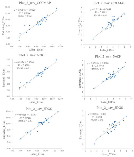 Figure 13 shows the linear fitting results of TH and CD extracted from models compared to those derived from Lidar reference values for Plot_2. The left column of the figure represents TH, while the right column represents CD. In the extraction of these two parameters, the central trees were excluded for comparison due to the fact that the Plot_2_Lidar model is missing some canopy information. For TH extraction, COLMAP’s R2 reached 0.8792, with an RMSE of 0.32 m. 3DGS and NeRF models have R2 values of 0.9289 and 0.9281, with RMSE of 0.47 m and 0.31 m, respectively, indicating that their extracted TH values are closer to Lidar TH values when compared to COLMAP. For CD extraction, COLMAP and NeRF both achieved R2 values exceeding 0.8, with 0.8105 and 0.8532, respectively, and RMSE values of 0.68 and 0.63. 3DGS performed the worst, with R2 of 0.7538 and RMSE of 0.70. Compared to the TH and CD parameters in Plot_1, both R2 and RMSE values deteriorated in Plot_2 due to increased canopy occlusion and complexity. The R2 values decreased by a range of 0.024 to 0.160, while the RMSE values increased by 0.01 m to 0.36 m.