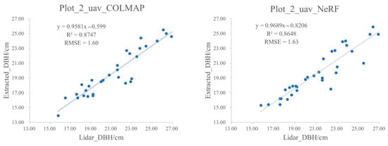 Figure 14 shows the DBH extraction results of the Plot_2_UAV model. Due to the sparse distribution of tree trunk points in the Plot_2_UAV_3DGS model, DBH fitting could not be performed, and some reconstructed tree trunks did not reach the required height for DBH (1.3 m). Therefore, DBH values could not be successfully extracted. The DBH values obtained from COLMAP and NeRF with R2 values of 0.8747 and 0.8648, and RMSE values of 1.60 cm and 1.63 cm, respectively.