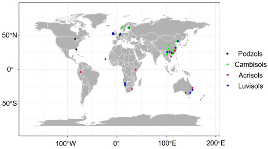 The dataset also provides soil classifications systems based on the World Reference Base for Soil Resources (WRB) and the Food and Agriculture Organization (FAO). However, not all samples are classified according to the WRB system, and a number of them lack WRB classification information. From this, 151 soil profiles were selected for the study (Table 1), representing 26 primary soil units. Due to differences in pedogenesis, the profile structure, number of sampled horizons, and sampling depth vary among soil classes, resulting in uneven sample numbers. Among them, Podzols include 14 profiles, but they have the highest number of samples, reaching 99, because of the well-developed profiles with more horizons. Nevertheless, Kastanozems, Cryosols, and Durisols have very few samples, with only one profile each, due to their limited distribution, sampling difficulty, and unique profile development. To ensure the robustness and representativeness of the models, four soil classes with complete WRB classification and relatively sufficient samples were selected for further analysis: Cambisols (17 profiles), Luvisols (16 profiles), Podzols (14 profiles), and Acrisols (13 profiles). These are presented as the top four soil classes in Table 1.