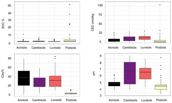 Figure 3 illustrates the distinct characteristics of SOC, CEC, clay content, and pH across the four soil classes. Podzol, found in high-latitude, humid regions, is a typical acidic soil with a surface layer of dark-colored litter (O horizon) and a dark grey humus accumulation layer (A horizon). As a result, Podzol exhibits the highest median, interquartile range, and upper outlier variability in SOC, with a low pH value suggesting its strong acidity. But its clay content and CEC are the lowest, suggesting a coarse texture, such as sandy soil. Acrisol, though low in SOC, has the highest clay content. This can be attributed to its tropical environment, where intense rainfall accelerates mineral weathering and clay formation. Nutrients are leached to deeper layers, forming a well-developed clay horizon. The physicochemical properties of Cambisol and Luvisol are relatively similar, and both of their SOCs are low. However, Cambisol has the lowest SOC among the four soils, and its pH is closer to neutral. This can be explained by Cambisol’s early developmental stage, with limited horizon differentiation and minimal morphological changes, retaining characteristics of its parent material. Consequently, Cambisol has not undergone extensive weathering or mineral transformation, leading to lower clay content and CEC than Luvisol. In contrast, Luvisol has a higher clay content and relatively greater CEC.