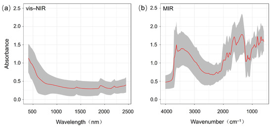 Mean absorbance curves and standard deviation ranges of vis–NIR (a) and MIR (b) spectra.