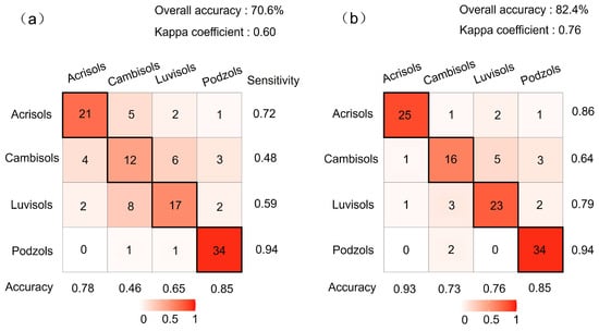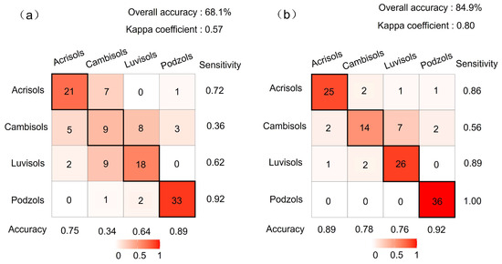 Confusion matrix of soil classification based on direct combination: PLSDA (a) vs. RF (b).