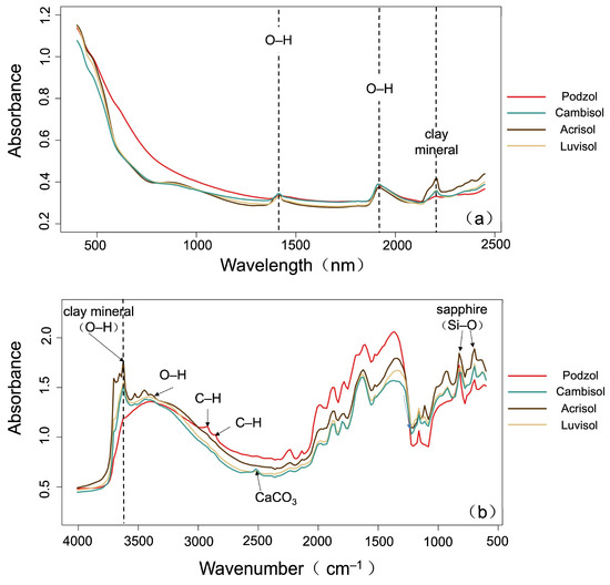 Figure 3 illustrates that Podzols exhibit notably higher mean values, ranges, and variability in SOC compared to other soil classes. These attributes provide the model with more distinguishable information, particularly features related to soil organic matter (SOM). In the vis–NIR region (Figure 9a), the absorption spectral features of Podzols are significantly stronger than those of other soil classes. This spectral region is predominantly influenced by chromophores and organic matter content in the soil [34]. Meanwhile, at around 1400 nm, Podzols show a weak absorption peak. This band is a major water absorption region, influenced by adsorbed water on the soil surface and structural water in the O–H lattice of clay minerals, and it lacks the Al–OH clay mineral absorption feature near 2200 nm. This is attributed to the absence of abundant clay minerals and iron oxide spectral features in Podzols, which reflects the extensive leaching of metal cations such as calcium, potassium, magnesium, and sodium during the intense acidic weathering process typical of this soil class. Consequently, Podzols exhibit lower CEC and base saturation (Figure 3). As a result, the vis–NIR spectral curve of Podzols is relatively flat. Podzols show exceptional classification performance in the MIR spectrum, mainly due to MIR’s ability to sensitively detect the chemical components and characteristic spectral signals in Podzols, particularly organic matter. They display unique C–H absorption bands at 2930 cm−1 in the MIR spectrum (Figure 9b), which are absent in other soils, distinguishing them from other soil classes. In the MIR range, spectral absorption features are more strongly correlated with soil organic matter content [53], which also explains the higher classification accuracy of Podzols in the MIR region. Overall, the distinct spectral characteristics of Podzols, especially within the MIR spectral range, significantly enhance the model’s classification capability.