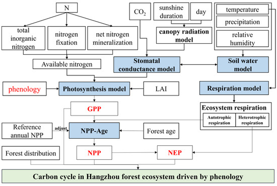 Hu, M.; Du, H.; Li, X.; Zhou, G.; Mao, F.; Huang, Z.; Xuan, J.; Zhao, Y. Simulation of the Carbon Cycle’s Spatiotemporal Dynamics in the Hangzhou Forest Ecosystem and How It Responds to Phenology. Remote Sens. 2025, 17, 1531. https://doi.org/10.3390/rs17091531