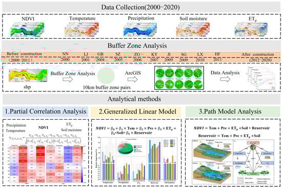 In addition to studying the direct impacts of reservoir construction on the surrounding vegetation, we also investigated the potential indirect impacts of climate change. First, we analyzed trends in the NDVI and climate variables before and after reservoir construction. Next, partial correlation analysis was used to explore the relationship between the NDVI and climate variables. A generalized linear model (GLM) was then employed to quantify the impacts of precipitation, temperature, ETp, soil moisture, and the reservoir on the surrounding vegetation. Finally, path analysis was used to further elucidate the mechanism of the reservoir′s impacts on the surrounding vegetation (Figure 2).
