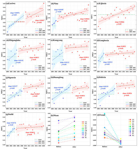 Rate of change of NDVI before and after reservoir construction from 2000 to 2020. Areas with statistically significant trends (p < 0.05) are marked, while p > 0.05 indicates non-significant trends.