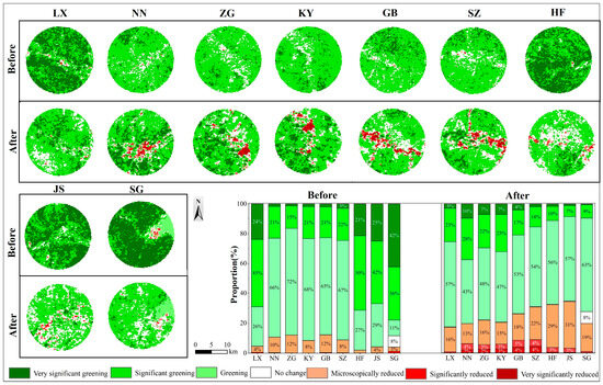 Over the past 20 years, all reservoirs have experienced extensive greening, with an upward trend in the NDVI (Figure 4). Before reservoir construction, approximately 90% of the areas exhibited healthy vegetation growth, while around 10% showed slight degradation. However, after the reservoirs were constructed, the proportion of areas with significant increases in the NDVI declined, particularly in regions such as LX, HF, JS, and SG, where the NDVI decreases were 56%, 61%, 60%, and 68%, respectively. The spatial distribution of these changes is not uniform, with a particularly noticeable decline in the NDVI around the reservoirs. Specifically, the NDVI within a 1–2 km radius of the reservoirs showed a significant decrease, likely due to the destruction of original vegetation communities during reservoir construction and the negative effects of urban expansion. In the reservoir buffer zones, the area of degraded vegetation increased significantly, accounting for approximately 20% of the total area. Of these degraded areas, about 5% exhibited severe degradation, with the majority located in urbanized regions. While the overall trend in the reservoir areas indicates a greening effect, the degradation in surrounding areas, especially near the shorelines, remains a concern. Spatial analysis (Figure 4) further reveals a marked decrease in the NDVI within a 1–2 km radius around the reservoirs, which can likely be attributed to the destruction of native vegetation and the expansion of urban areas. Although regions farther from the reservoirs have seen significant vegetation recovery, aided by the regulating role of water sources, the ecological impacts around the reservoirs remain pronounced. These findings underscore the long-term effects of reservoir construction on surrounding ecosystems, particularly in the context of changes in microclimate and hydrological conditions, highlighting the complexity and urgency of ecological protection in these areas.