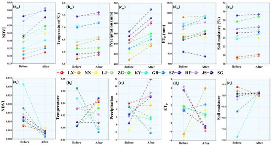 As illustrated in Figure 5, the post-reservoir construction period is characterized by marked increases in vegetation cover, temperature, precipitation, ETp, and soil moisture compared to the pre-construction period. However, the rate of change varies significantly across regions.