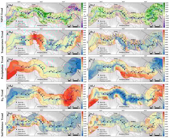 Spatial trends in terraced watersheds before and after reservoir impoundment. B indicates before reservoir construction; A indicates after reservoir construction. (a–e) represent NDVI, temperature, precipitation, ETp, and soil moisture, respectively.
