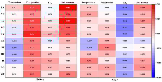 As shown in Figure 8, the correlation coefficients between the climatic factors and the NDVI changed significantly after reservoir storage, highlighting the profound impact of reservoir construction on local climate and vegetation growth. Notably, most reservoirs exhibited trends comparable to those of the ZT reservoir, where the correlation between temperature and the NDVI increased, while the correlations between the NDVI and precipitation, ETp, and soil moisture decreased. The positive correlation between temperature and the NDVI generally increased after reservoir construction. However, this correlation shifted from negative to positive in some areas, such as the HF and JS reservoirs. This indicates that reservoir construction altered local climatic conditions, enhancing the positive effect of temperature on vegetation growth. Conversely, the correlation between precipitation and the NDVI decreased, as observed in the ZT basin, where it reduced from 0.319 to 0.194. This trend indicates that reservoir construction increased regional precipitation, thereby promoting vegetation growth. The correlation between ETp and the NDVI shifted from positive (0.122) to negative (−0.092), suggesting that reservoir construction altered the microclimate, with increased water loss subsequently inhibiting vegetation growth. Similarly, the positive correlation between soil moisture and the NDVI weakened. For example, in the ZT watershed, this correlation decreased from 0.274 to 0.184, suggesting that elevated soil moisture levels after reservoir construction negatively affected plant growth. In summary, reservoir construction positively influenced vegetation by increasing temperature, precipitation, and soil moisture while exacerbating the negative impacts of ETp on vegetation. These findings suggest that reservoirs play a positive role in regulating the regional water cycle and promoting vegetation recovery. However, their overall impact on local climatic conditions requires further comprehensive ecological investigation.