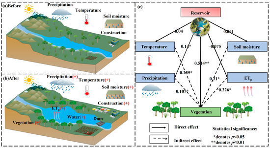 Impact of reservoir construction on vegetation growth in reservoir areas. (a,b) Map of changes in environmental factors before and after reservoir construction; (c) Pathways between climate, reservoir construction, and vegetation cover.