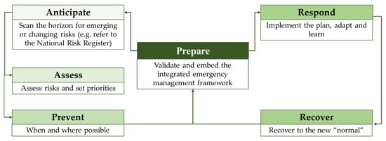 The UK Civil Contingencies Act 2004 describes an emergency as an “event or situation which threatens severe damage to the UK’s human welfare, environment, or security” [25]. Moreover, it outlines the UK’s framework for responding to and managing emergencies, ensuring public safety and the continuity of services. Figure 1 shows the Integrated Emergency Management Framework (IEMF) model, which consists of a six-stage cycle that supports the UK Government Cabinet Office’s resilience management and is used by the UK civil protection sector.