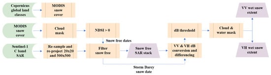 The backscatter coefficients were converted to decibels (dB) using the 10 transformation and, similar to work by Snapir et al. [40] and Nagler et al. [44], we set a threshold of −2 dB to determine wet snow pixels with respect to are the backscatter coefficients for the snow and reference images, respectively. Finally, cloud masks from MODIS and water masks from Copernicus Global Land Cover [68] were applied to the scene to consider only cloud-free land pixels and compare them against the NDSI values in the MODIS imagery.