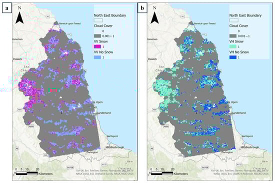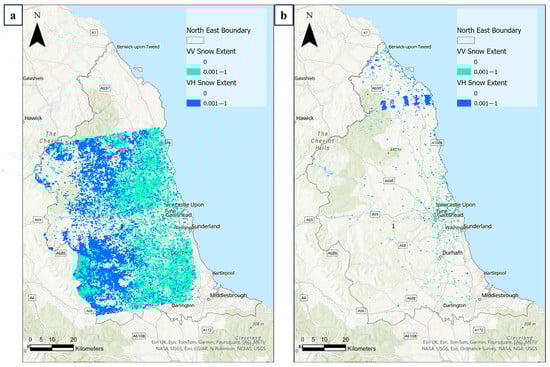 Snow extent VV and VH polarisations: (a) 14 February 2021 (note limits of image scene) and (b) 20 February 2021.
