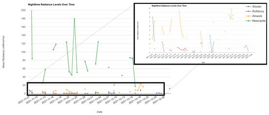 As reported by the local operator, Northern Powergrid, numerous households suffered from power cuts on the night of Storm Arwen (26–27 November 2021): Alnwick (c. 260 households), Wooler (c. 70) and Newcastle (c. 250) [78]. Following the night of the storm, different households in these areas also reported power cuts. Unfortunately, the night of Storm Arwen had cloud coverage of 100% over both Alnwick and Newcastle, obscuring nighttime data. The nights of 27 November through to 08 December also all presented a high level of cloud coverage (92–100%) for the Alnwick area, with the exceptions of 1–2 December and 6–7 December. Little nighttime light is recorded in the mean radiance data for the nights of 28–30 November and 3–4 December. On 4 December, Northumberland areas (such as Wooler) and Newcastle reported further power cuts, leading to missing recorded nighttime data from 4 to 7 December. From the night of 7–8 December, we see the activity of nighttime radiance for the rural areas, indicating that power was restored, which also correlates with the date Northern Powergrid estimated for power restoration.