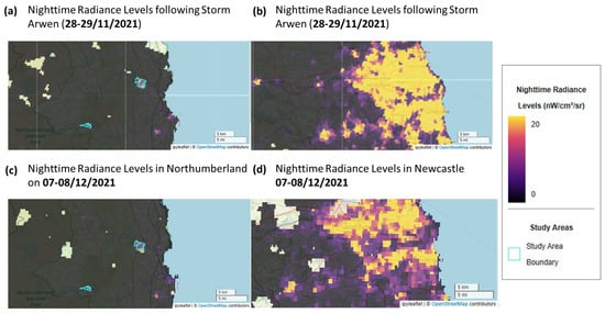 Figure 10 presents map outputs for two different nights upon which data were acquired, and which are relatively important to the storm and its associated impacts for the study areas. VNP46A2 quality flags are used to mask pixels affected by clouds, excluding them from the output graphic. Figure 10a visualises Northumberland two nights after the storm (28–29 November 2021) displaying restored power in the county, and (b) represents the same night in Newcastle; (c) visualises the night following further reported power cuts (4–5 December 2021) in Northumberland, and (d) the corresponding night in Newcastle. As the households affected were estimated from available online sources, we suggest obtaining historical data from Northern Powergrid during Storm Arwen and overlaying the nighttime imagery to understand the correlation between definitively known power cuts and remotely sensed irradiance patterns as future work.