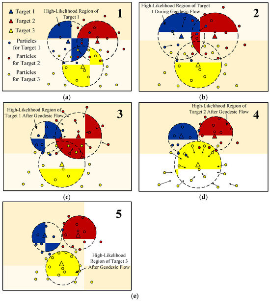To overcome this problem, measurement intensity is used to determine the sequential update order, and the auxiliary Geodesic flow filter is employed. In Figure 1b–d, particles are guided to high-likelihood regions while keeping proper diversity, and in Figure 1e, the three particle distributions are well separated.