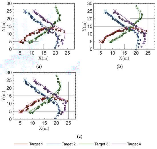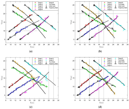 In this section, a relatively simple scenario with a fixed number of targets is considered. In this scenario, the radar sensor is located at the origin, with a scanning range of [0, 30 m] × [0, 30 m] and a scanning period set to T = 1 s. Four targets move in a two-dimensional plane, and the target states are modeled using the 5D constant velocity model . There are four targets in the scenario, and initial state parameters are set as follows: [5 m, 0.2 m/s, 5 m, 0.2 m/s] for target 1, [7 m, 0.2 m/s, 25 m, −0.2 m/s] for target 2, [9 m, 0.2 m/s, 5 m, 0.2 m/s] for target 3, and [11 m, 0.2 m/s, 25 m, 0.2 m/s] for target 4. The total frame is 35, in which the targets move in a straight line with constant speed from frames 1 to 15, converge from frames 15 to 25, and perform maneuvers from frames 25 to 35. During this process, the energy of each target at each frame will spread to the tracks of nearby targets, which may affect the robustness of the tracks. In maritime scenarios, the echoes of targets during scanning intervals often fluctuate, so we use the Swerling 1 model to model these fluctuations. In our experiments, clutter parameters are set as shape parameter = 2 and scale parameter = 1, and the SCR of the targets is set to 6 dB, calculated by , where P is the signal intensity.