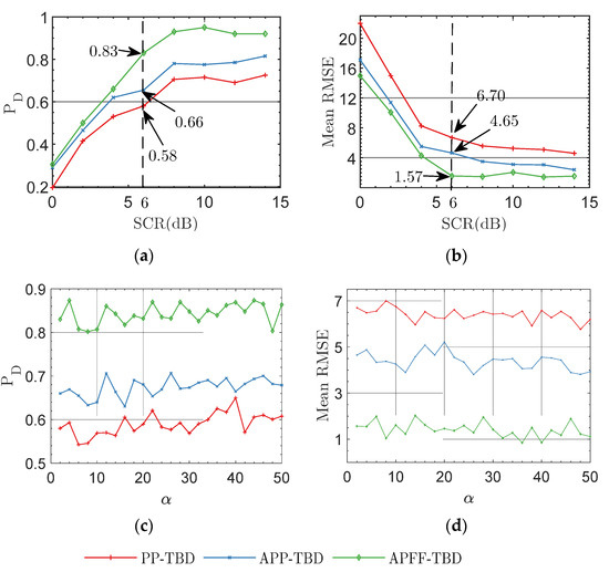 The tracking performance of the three algorithms with a fixed number of targets at 6 dB: (a) detection success probability under different SCRs; (b) the average RMSE under different SCRs. (c) Detection success probability under different shape parameters and scale parameters at an SCR of 6 dB, where . (d) The average RMSE under different shape parameters and scale parameters at an SCR of 6 dB, where .