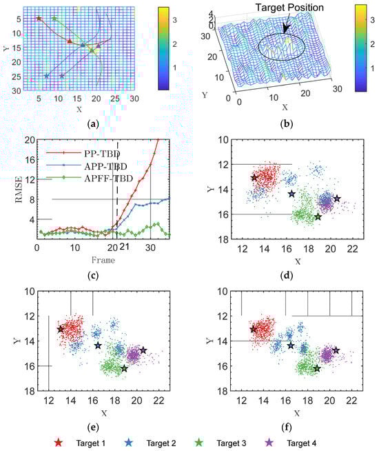 Next, we further analyze how the three algorithms handle adjacent interference between targets. Figure 6a shows the movement of the targets in one experiment, where triangles represent the true positions of the targets at frame 21, and the corresponding energy of the target echoes is shown in Figure 6b, where the tracks converge and the energies of the target group interfere with each other. Figure 6c shows the RMSE of tracking at this time, and it can be seen that after frame 21, there is a significant difference in the tracking performance of the three algorithms. Figure 6d–f show the particle importance distributions given by the APFF-TBD and APP-TBD algorithms at frame 21, where the asterisks represent the true positions of the targets and the points represent particle distribution. When particles can effectively sample the true measurement position, asterisks and points with the same color should be adjacent.