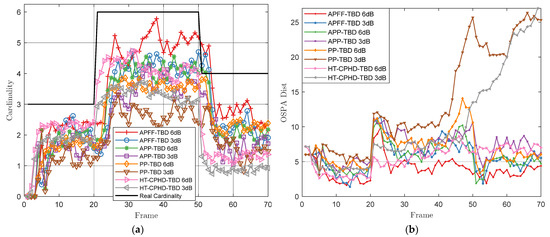 The performance of the four algorithms at 3 dB and 6 dB is shown in Figure 8. Figure 8a shows the mean of the estimated cardinality versus time. For the cardinality estimation, APFF-TBD shows superiority over the other algorithms. Specifically, the cardinality estimation performance of APFF-TBD at 3 dB is comparable to that of APP-TBD at 6 dB. For the first three frames in PP-TBD, APP-TBD, and APFF-TBD, the estimation is 0, as the targets have not yet been detected. There is a delay of about three frames between the estimation and the actual number of targets. Similar effects can be observed around frames 20 and 50. On the contrary, no detection and termination procession is used in HT-CPHD-TBD, so the OSPA changes faster.