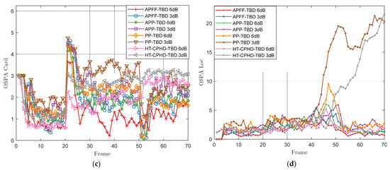 The standard deviation of the target number, location, and distance of the optimal sub-pattern assignment (OSPA) with a cut-off parameter c = 2 and a metric parameter p = 1 is adopted to measure the estimation precision of the algorithm in Figure 8b–d. Figure 8b presents the OSPA error performance comparisons over time between the PP, APP, HT-CPHD, and APFF implementations under different SCRs. Overall, it is clear that the state estimate performance of APFF-TBD is much better than that of PP-TBD. Additionally, the estimated accuracy of the methods with 6 dB is significantly better than that with 3 dB. Specifically, in Figure 8b, PP-TBD at 3 dB shows a significant tracking divergence problem after frame 40, while APFF-TBD maintains the stability of the state estimates. Additionally, in Figure 8b, APFF-TBD at 3 dB shows comparable track estimation performance to APP-TBD at 6 dB. Finally, in Figure 8c, APFF-TBD shows comparable performance with HT-CPHD-TBD before frame 20, and much better performance after that.