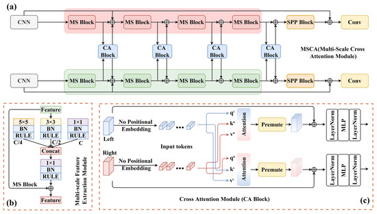 The overall framework is shown in Figure 2a, which we refer to as the MSCA (Multi-Scale Cross-Attention Module). The MSCA module is designed to extract robust features from satellite stereo images by combining two key capabilities: (1) analyzing image content at multiple scales (MS Block) and (2) dynamically focusing on important regions through cross-view attention (CA Block).
