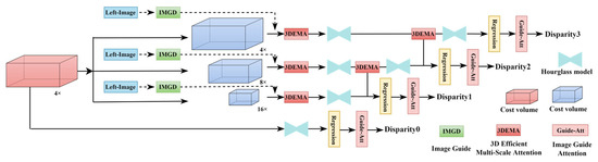 This process integrates and smooths information across disparity layers, which aids in recovering high-quality disparity maps in complex scenes. Inspired by SSPCV-Net [57] and HMSMNet, and taking into account the characteristics of the images, we designed the 3D cost aggregation process, as shown in Figure 3. Unlike SSPCV-Net and HMSMNet, we did not apply pooling to downscale the original extracted features. Instead, we directly applied 3D convolution to the constructed cost volume, generating cost volumes at different scales. This approach avoids the information loss caused by pooling, preserving more details and improving depth inference. Additionally, during this process, we introduced 3D feature information from the original images through the IMGD module, which compensates for the loss of information in deep feature extraction. In terms of feature fusion, we designed a 3D EMA feature fusion module based on EMA [58] to integrate the original image, cost volume, and cost volumes at different scales. The fused cost volume was input into an hourglass module for preliminary cost aggregation and disparity regression, resulting in initial disparity predictions. Finally, the initial disparity results were refined through the feature map guidance module, Guide Attention, to produce the final disparity map.