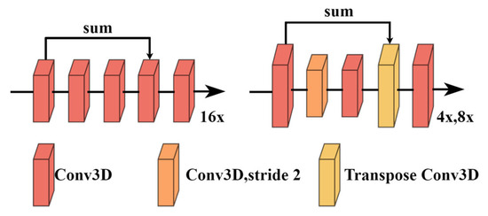 We applied different hourglass modules to the cost volumes at different scales, as shown in Figure 6. At the 16× scale, the cost volume undergoes no down-sampling or transposed convolution to avoid excessive down-sampling that could result in the loss of details, thereby preserving high-resolution features. At the 4× and 8× scales, we applied a single down-sampling and transposed convolution to effectively reduce the computational load and capture broader contextual information. This multi-scale processing approach balances computational efficiency with information retention, ensuring the model performs well at all scales. The overall design uses five 3D convolutions, reducing the number of convolution layers to effectively lower computational complexity and memory consumption, thereby improving the model’s operational efficiency. At the same time, the hourglass module, with appropriate processing at different scales, extracts and merges key features across multiple scales, thereby balancing performance and efficiency.