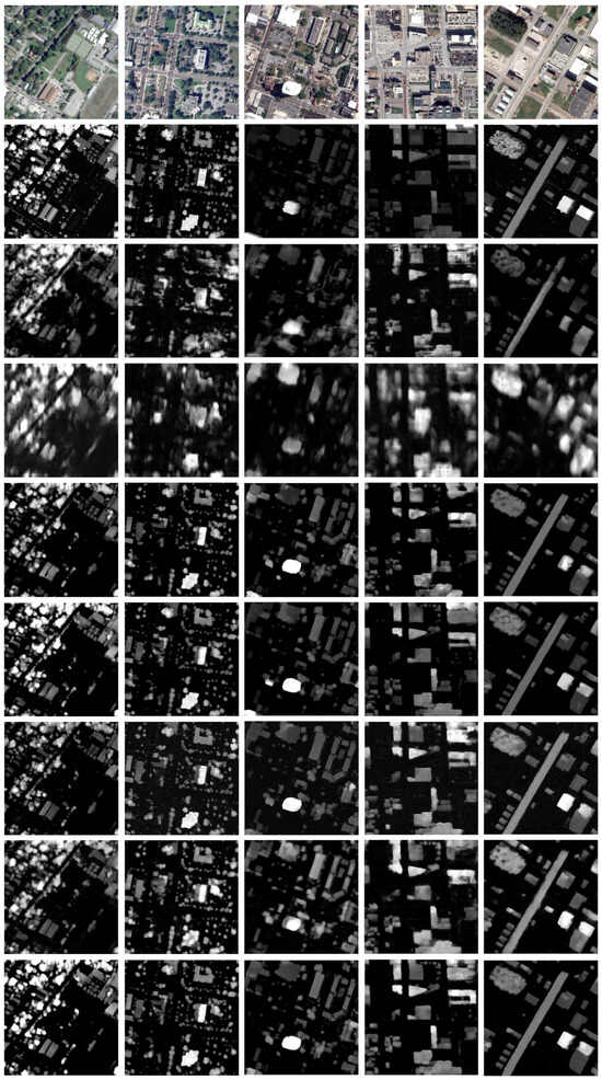 The US3D dataset [60,61] was provided by the IEEE GRSS (Geoscience and Remote Sensing Society) and focuses on 3D reconstruction and stereo matching tasks in urban environments, particularly in the application of high-resolution satellite stereo images. Tracks 2 and 3 of this competition involve stereo matching and 3D modeling tasks. It provides 4292 RGB images, along with corresponding ground truth disparity maps. These images were collected from the WorldView-3 satellite, covering the cities of Jacksonville and Omaha in the United States, with a size of 1024 × 1024 pixels and an image resolution of approximately 0.3 m. All images were preprocessed with RPC-based orthorectification and epipolar rectification to eliminate off-nadir distortions [60,62]. Ground truth disparities were derived from airborne lidar (80 cm ANPS) and projected into rectified coordinates with sub-pixel residual errors (<0.1 px).