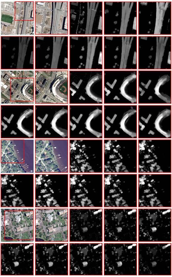 In terms of model parameters, the MSCA module significantly enhances detail recovery capability by introducing multi-scale convolutional kernels and cross-view attention mechanisms while only increasing parameters by 0.22 M and computations by 29 G FLOPs. This leads to reductions of 7% and 15% in the EPE metric on the Jacksonville and Omaha datasets, respectively, and decreases of 11% and 23% in the D1-error metric. Although the 3D cost volume aggregation module incurs higher computational costs (an additional 87.19 G FLOPs), it demonstrates particularly outstanding performance in complex scenarios on the Omaha dataset, achieving a 26% improvement in EPE. Experimental data further confirm the unique advantages of the 3D EMA module in handling high-disparity regions, as well as the critical value of the image guide module in feature preservation. Particularly noteworthy is the refinement module, which innovatively combines max pooling and average pooling operations to reduce local detail recovery errors by 13–17%. Overall, through synergistic optimization of these modules, CAGFNet achieves reductions of 24% and 42% in EPE metrics on the Jacksonville and Omaha datasets, respectively, at the cost of only a 0.48 M parameter increase, demonstrating an excellent performance–computation efficiency balance. That said, we acknowledge that the current computational scale of 5.70 M parameters and 497.71 G FLOPs does increase computational overheads to some extent, which will be an important direction for future optimization work.