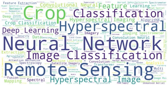 Figure 3 presents the most frequently occurring terms in the titles and keywords of the reviewed studies, with font size corresponding to their frequency. The cloud tag provides an overview of the dominant themes covered within the literature. It highlights that hyperspectral remote sensing imaging is the most frequently cited input data, while Convolutional Neural Networks (CNNs) are the most widely used DL method for crop classification.
